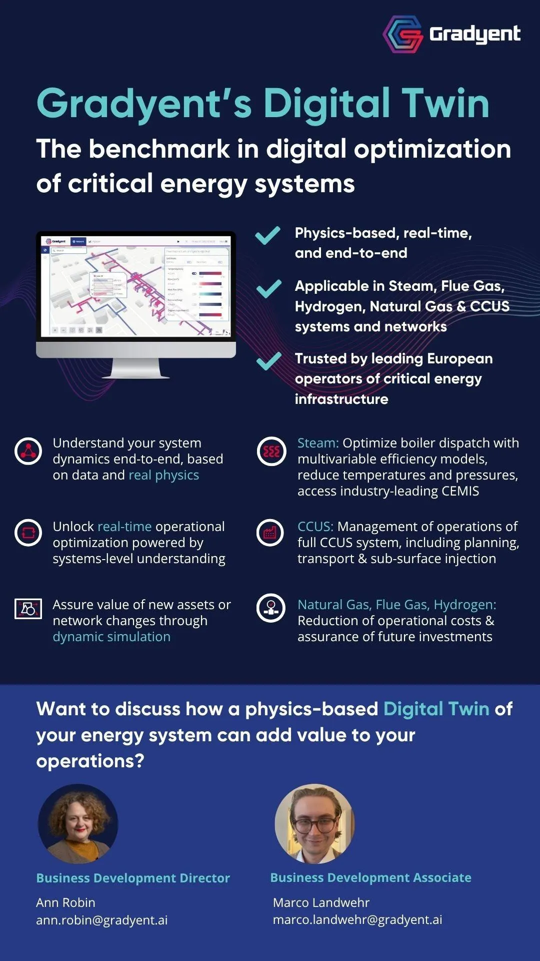 Gradyent has developed software based on Digital Twin technology that makes a digital copy of the complete physical steam system, combining geospatial, weather and sensor data with physics-based models and AI.